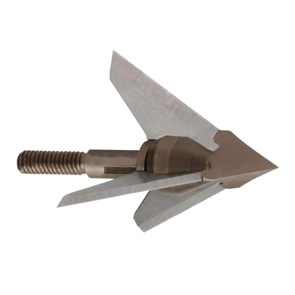The QAD Exodus Broadheads (Deep Six) are fixed blade, cut-on-contact broadheads designed for field point accuracy and remarkable penetration. They feature Blade Over Shaft (BOS) technology for a super short head and precise accuracy, tempered 400 series stainless steel construction, and a Rock-buster hardened SST tip. Each broadhead weighs 100 grains, has a cut diameter of 1-1/4 inches, and includes three blades with a thickness of .040 inches. The package contains three broadheads.
